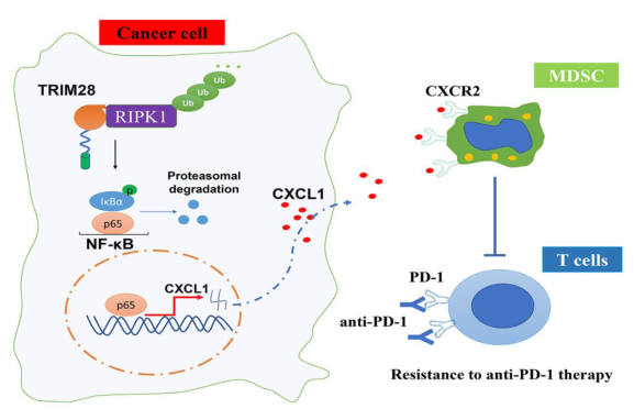 研究結(jié)果顯示TRIM28的表達(dá)與NSCLC中抑制性髓源性抑制細(xì)胞(MDSCs)的浸潤呈正相關(guān)。此外,沉默TRIM28可通過重塑炎癥腫瘤微環(huán)境來增強(qiáng)抗pd -1免疫治療的療效。在機(jī)制上,研究者證明TRIM28可以物理地與受體相互作用蛋白激酶1 (RIPK1)相互作用,并促進(jìn)k63相關(guān)的RIPK1泛素化,這對于維持NF-κB通路的激活至關(guān)重要。E3連接酶結(jié)構(gòu)域的突變證實(shí)了E3連接酶活性在trim28介導(dǎo)的NF-κB激活中的重要作用。進(jìn)一步實(shí)驗(yàn)發(fā)現(xiàn)TRIM28可通過激活NF-κB信號通路上調(diào)CXCL1的表達(dá)。CXCL1可與MDSCs上的CXCR2結(jié)合,促進(jìn)其向腫瘤微環(huán)境遷移。TRIM28敲除增加了免疫功能小鼠對抗pd -1治療的反應(yīng)性,其特征是CD8+T腫瘤浸潤淋巴細(xì)胞增加,MDSCs減少。