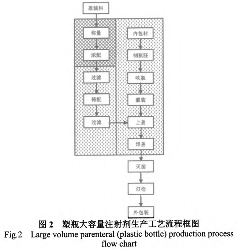 大輸液的生產過程主要包括原輔料的準備、稱量、濃配、稀配、灌封、滅菌、燈檢、外包裝等工序。圖1、2、3分別為軟袋大輸液的生產工藝流程框圖、塑瓶大輸液的生產工藝流程框圖以及玻瓶大輸液的生產工藝流程框圖。